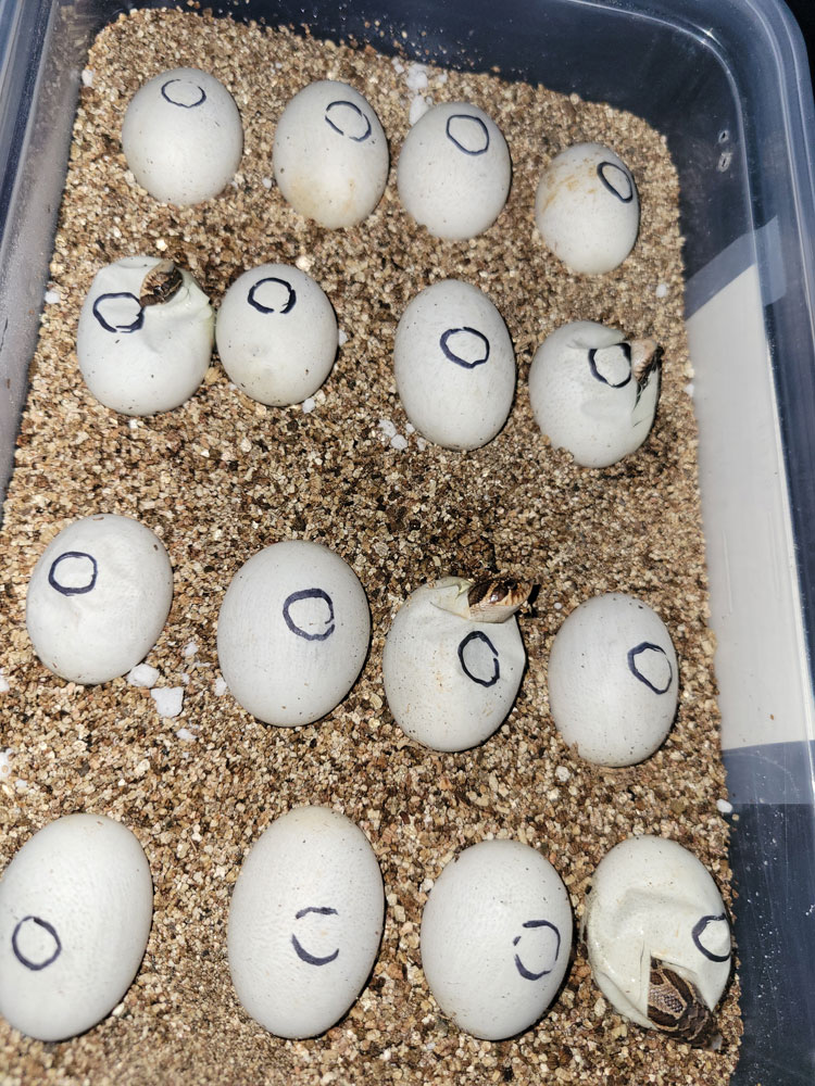Now Mary Ann was listed as having a 66% chance of being Heterozygous (Het) for Albino. So to prove out that potential one way or another we paired her with our Extreme Red Albino male Shippo. Out of 16 good eggs, there are no visual albinos here, (each egg would have a 50% chance of producing an Albino if she were Het) So we can safely say we didn’t hit the odds on that potential Het. Mary Ann HAS been proven for Het Axanthic though, so we’ll be looking for a lovely Purple-Line Axanthic boyfriend for her. 😉